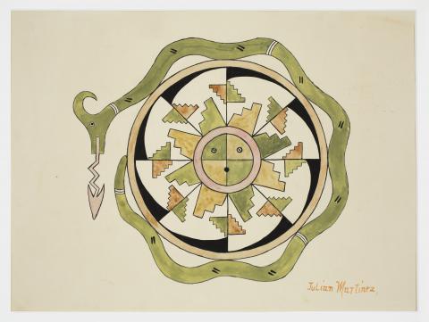 Julián Martínez (San Ildefonso Pueblo, 1885–1943), An Avanyu surrounding a polychrome dish, ca. 1930–40, watercolor on paper, Gift of Juli Shea Towell (Class of 1955) and Gil Towell, 2016.12.5