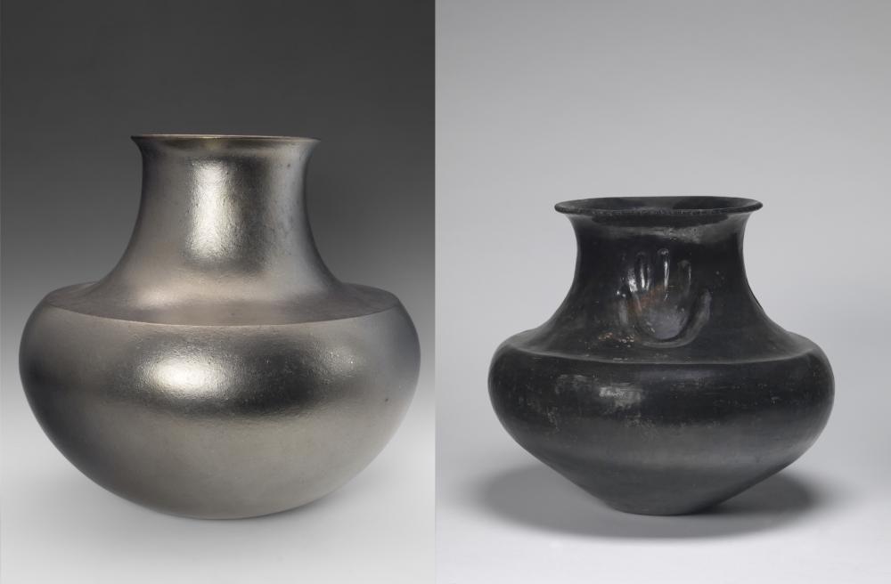 (left) Lonnie Vigil (Nambé Pueblo, b. 1949), Jar (olla), ca. 2002, micaceous earthenware, Gift of Juli Shea Towell (Class of 1955) and Gil Towell, 2016.12.3; (right) Attributed to Sara Fina Tafoya (Santa Clara Pueblo, ca. 1863–1949), Double shoulder jar (olla), ca. 1900–40, burnished earthenware with slip, Joseph Allen Skinner Museum, Mount Holyoke College, SK K.110